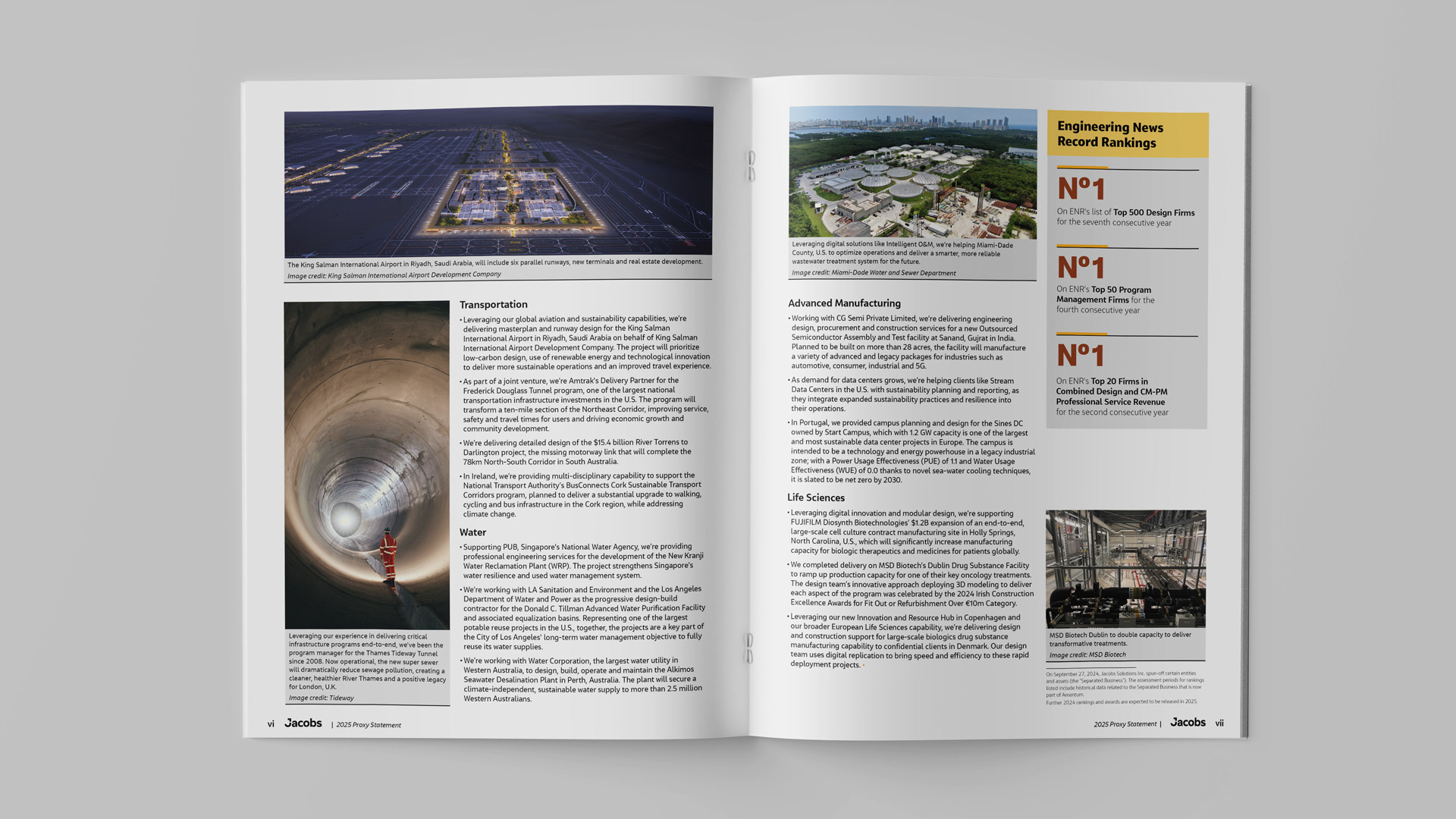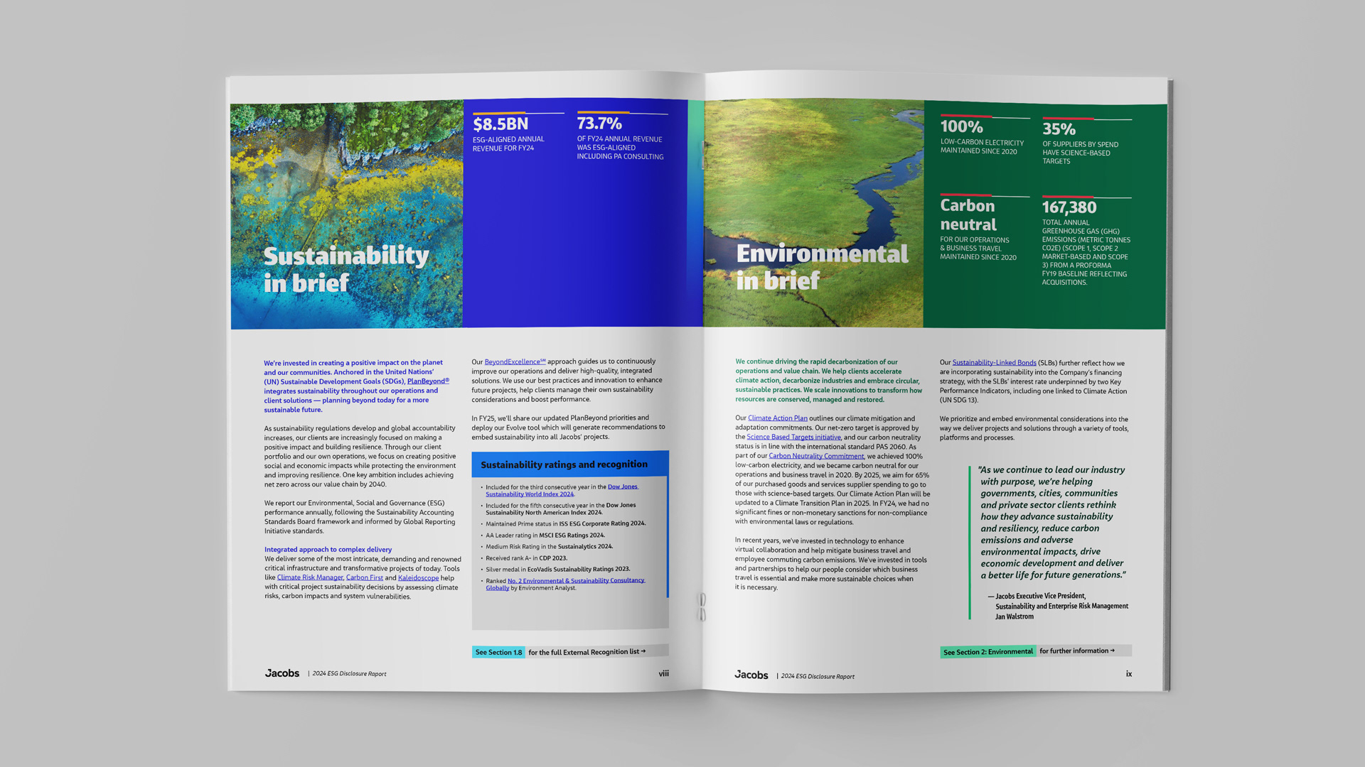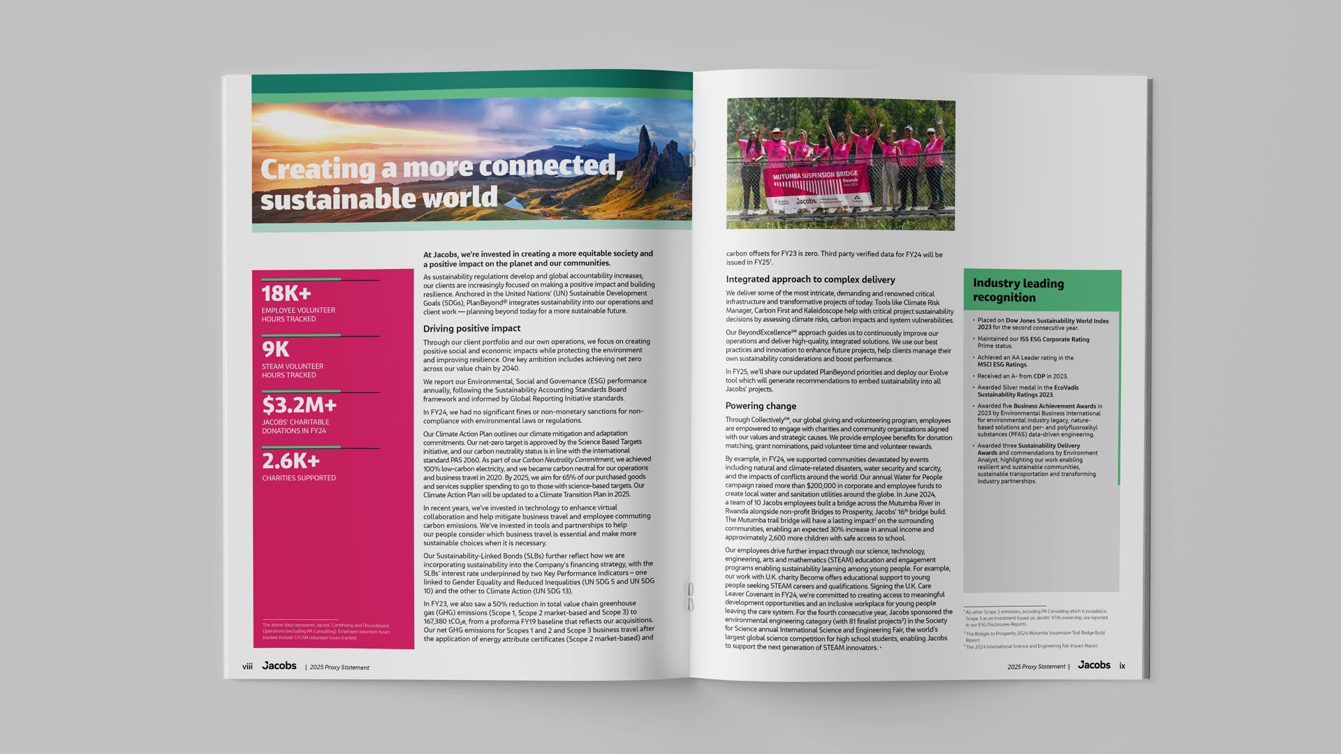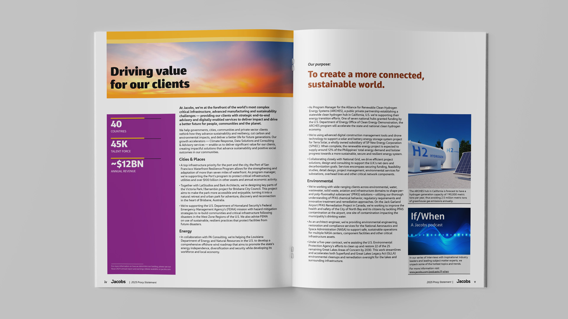 In 2024 I was the design lead of 2025 Proxy and summary pages of the ESG Report for Jacobs, a Fortune 250 company. I was responsible for designing the layout of the documents and cooperated with the company's Creative Director on the cover design exploration.