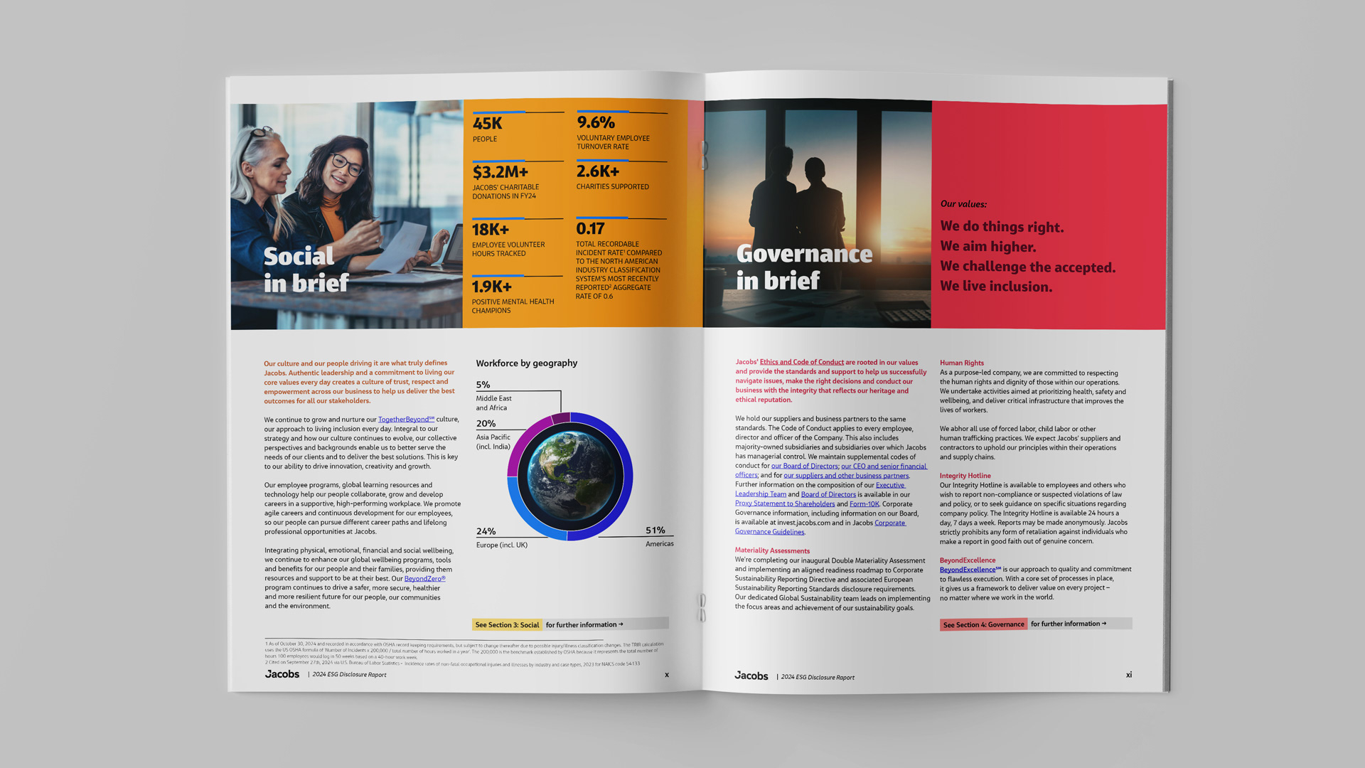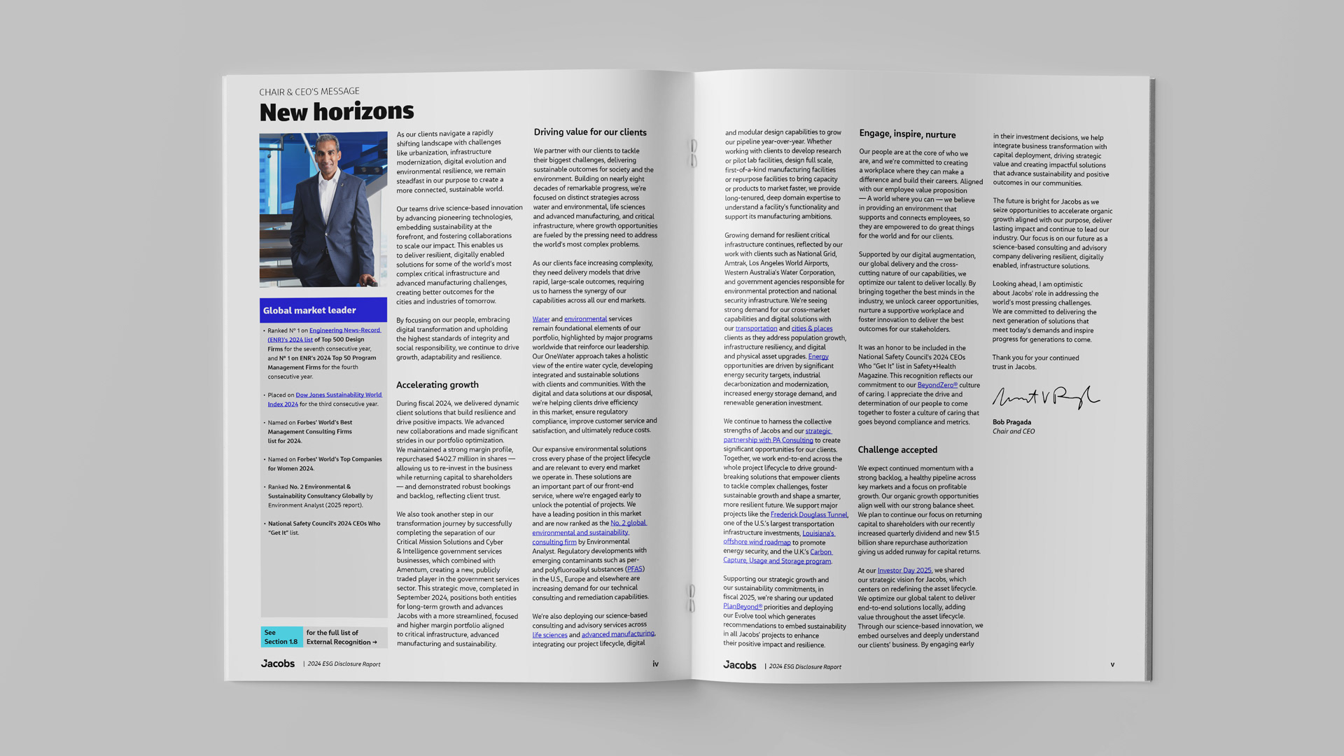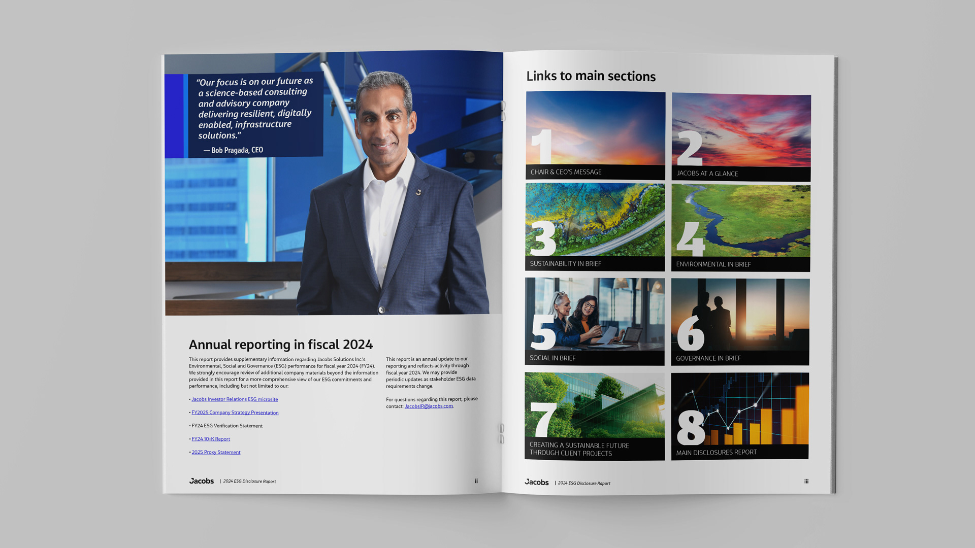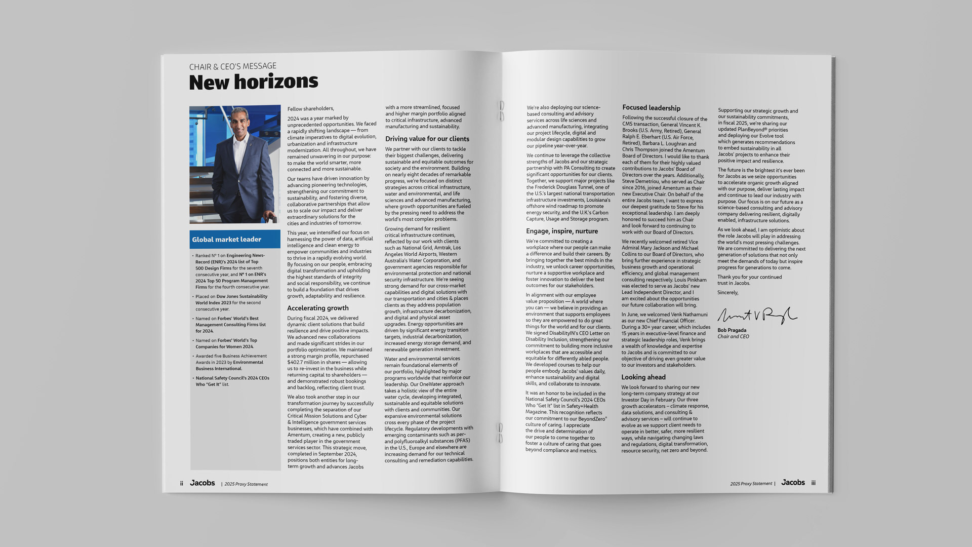 In 2024 I was the design lead of 2025 Proxy and summary pages of the ESG Report for Jacobs, a Fortune 250 company. I was responsible for designing the layout of the documents and cooperated with the company's Creative Director on the cover design exploration.