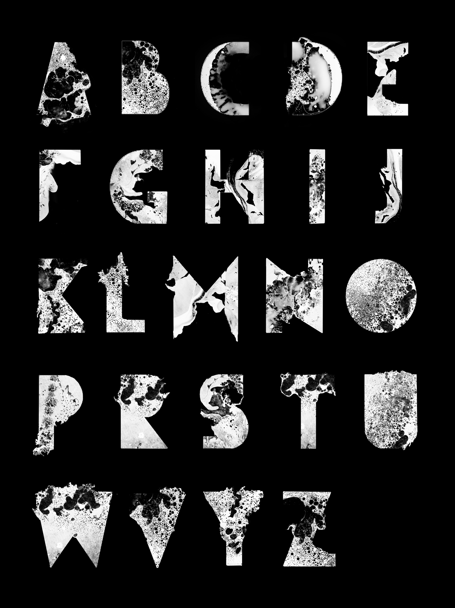 Experiment intended to blend two different graphic fields: photogram and typography. It led to creating characteristic letters with a very expressive style. The typeface works best at large sizes, such as posters, due to the amount of details.